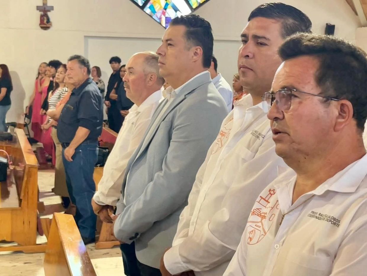 El alcalde Raúl Alberto Antuna Ulloa, acompañado de su esposa Adhilenne Hinojos y funcionarios del Ayuntamiento, asistió a una misa para pedir por el buen desarrollo del XXXIV Encuentro Santabarbarino y por la seguridad de todas las familias durante estos días de fiesta.